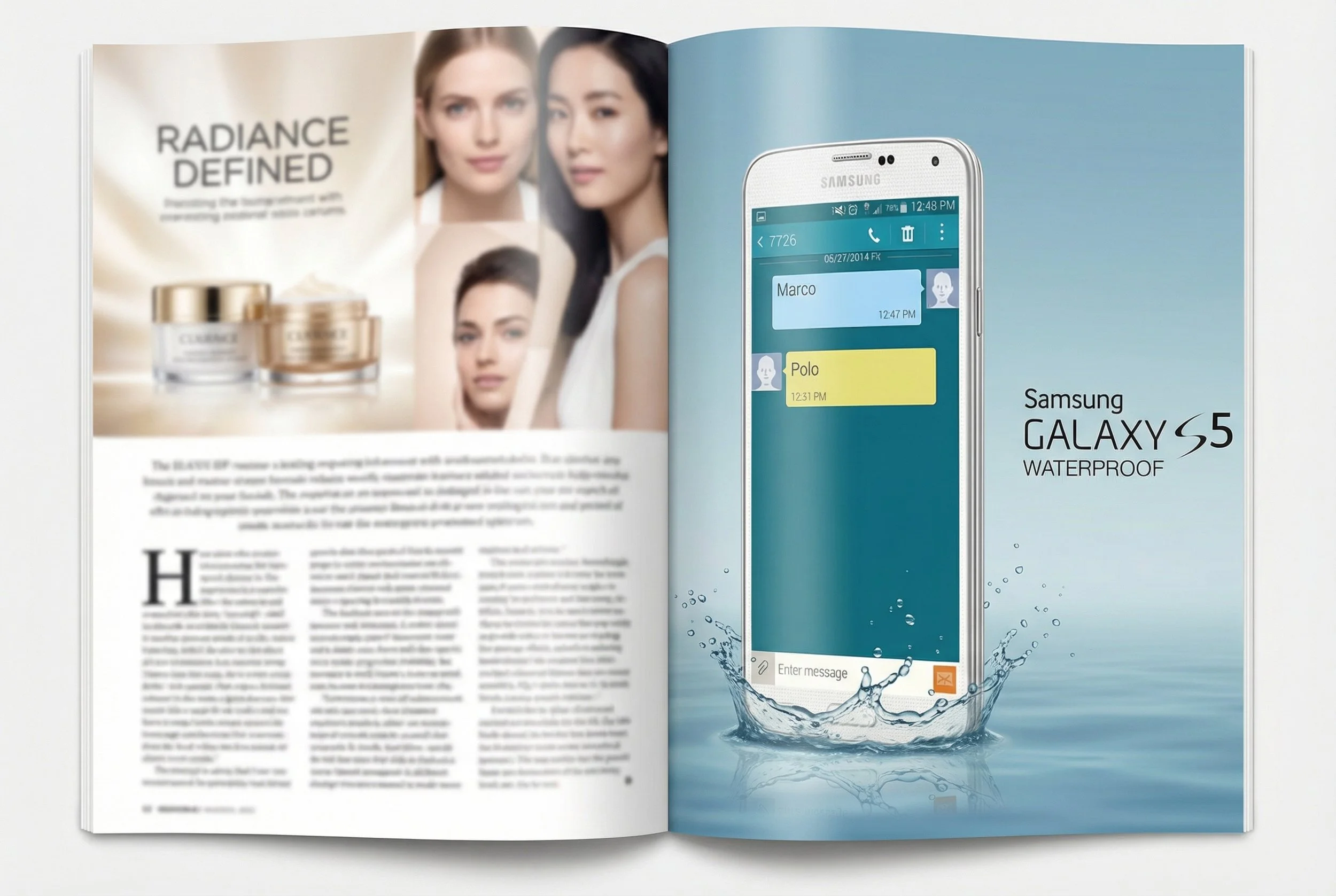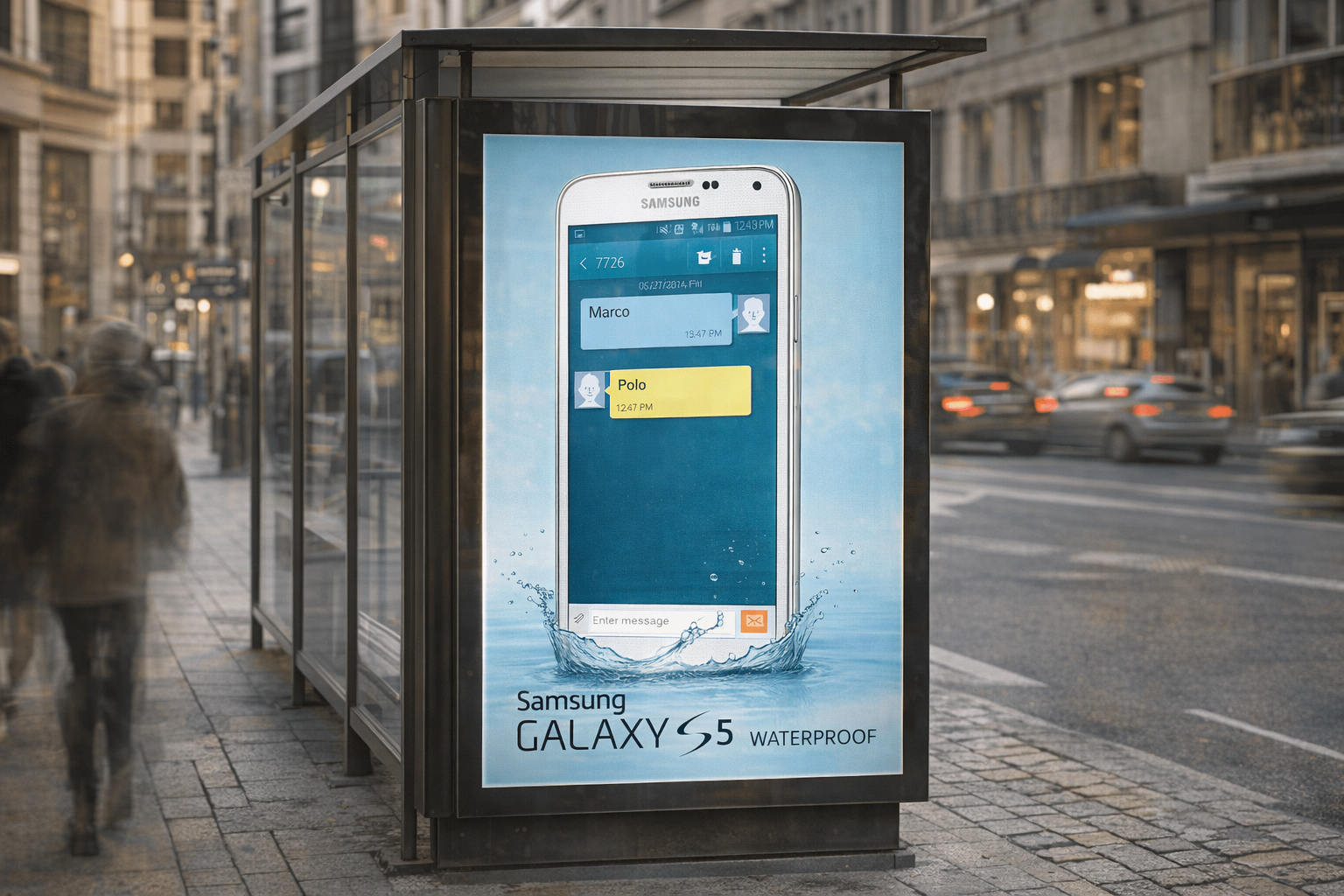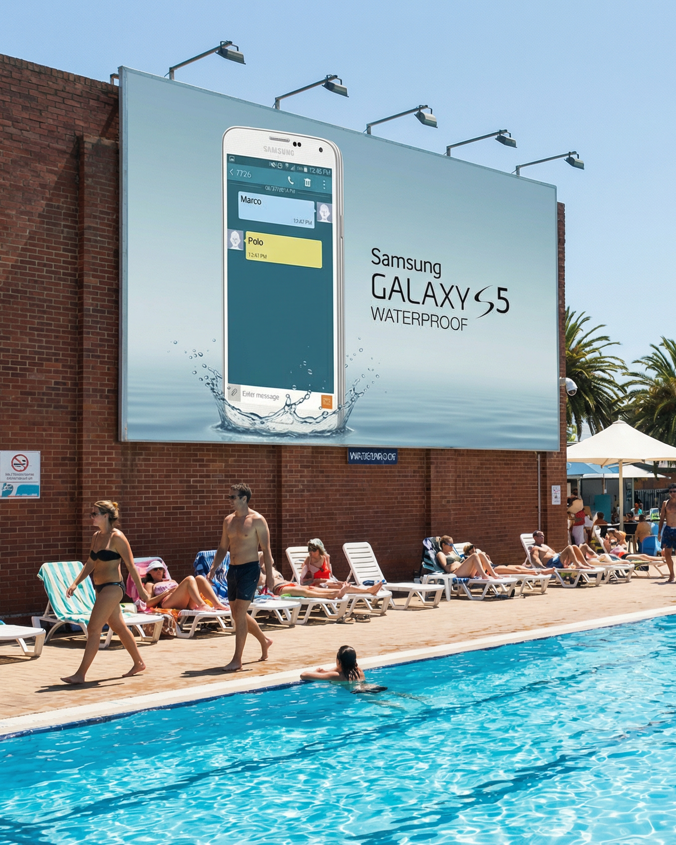 Water and phones don’t usually mix. One drop and it’s game over. But with the Samsung Galaxy S5, that rule no longer applies. We wanted to approach this campaign with absolute simplicity, stripping the idea back to just two words: “Marco. :Polo.” A familiar poolside call becomes the entire message, paired with a single striking visual. No heavy copy, no technical explanation, just a confident demonstration of durability. With the Galaxy S5, we invite you to bring your phone into the pool.